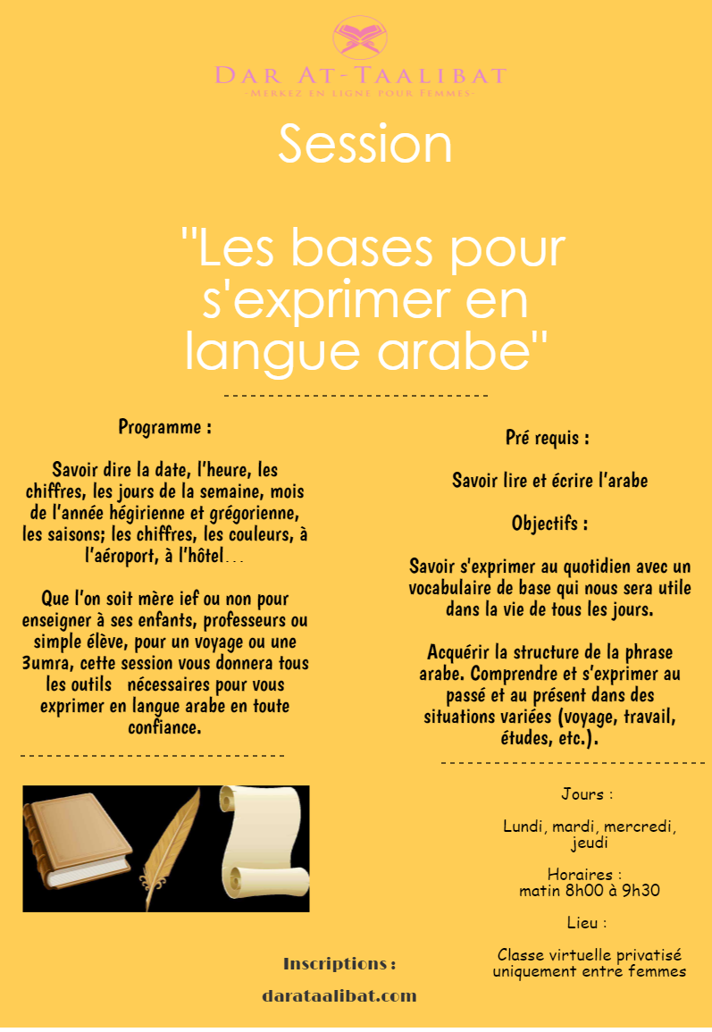 Que l’on soit mère ief ou non pour enseigner à ses enfants, professeurs ou simple élève, pour un voyage ou une 3umra, cette session vous donnera tous les outils nécessaires pour vous exprimer en langue arabe avec plus de confiance.